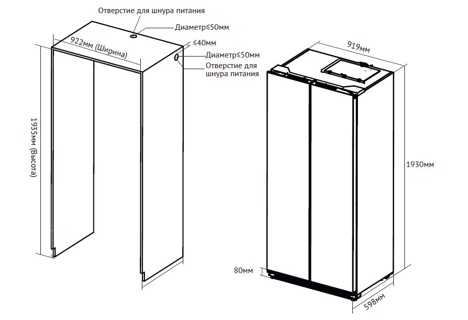 - Recess size for embedding (WxHxD), mm 922х1935х600
